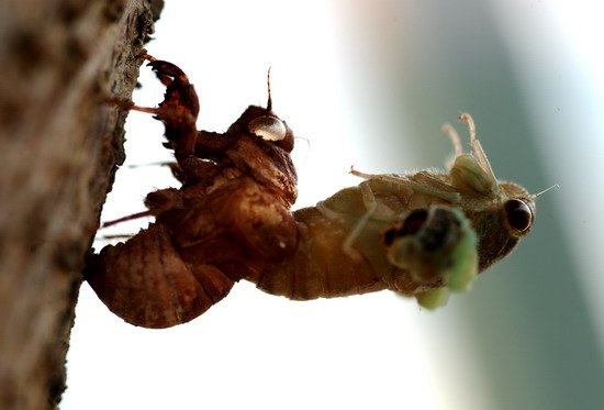 从土里钻出来后,它们会爬上树,然后蜕壳,慢慢获得一层黑亮和橙色的外壳。然后雄性就开始浪叫,求偶(有些人把叫声描述为“一艘外星飞船逼近的声音”)。