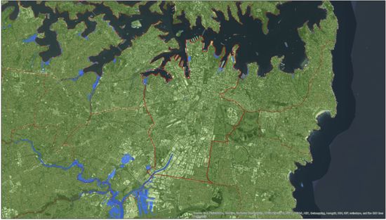 最差情景下预测的2100年悉尼海平面位置,淡蓝色代表淹没区域。NCCARF