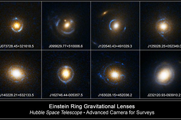 远处天体发出的光线抵达地球的过程中,受到途中大质量天体的影响产生弯曲,导致抵达地球的影像仿佛是来自多个地方的效果,称为引力透镜。特别地,当光源、透镜天体和观测者在一条直线上的时候,光源看起来呈现环状,由此得名爱因斯坦环。