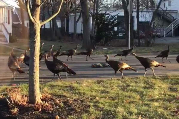 美国波士顿网友看到十几只火鸡,围着一只似乎被撞死在路上的猫咪团团转...转啊转...