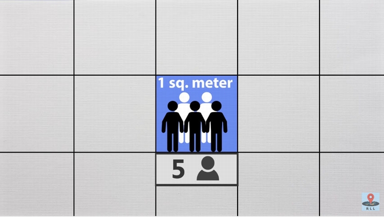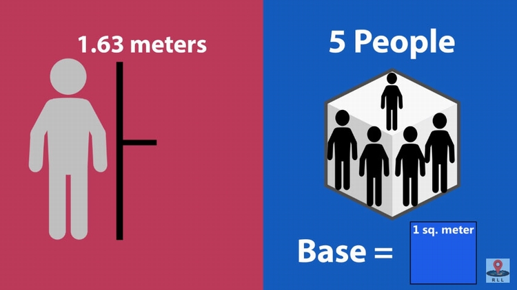 如果我们把2D升到3D,就能一口气让建筑容纳更多人。首先人类的平均身高是163公分,所以我们建造一个底是1平方公尺、高是163公分的立方体,平均来说就能容纳5个人。所以一个人平均占用0.326立方公尺,或是一立方公尺可以容纳3.07个人。