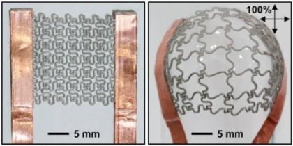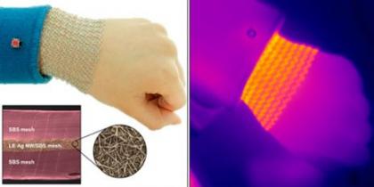 网格中相互交错的缠绕银质纳米线被两层绝缘通气的透明热塑弹性体层夹在中间。线和弹性体材料都能延展和收缩,能贴合膝盖或者手腕等关节的轮廓。用这种网格做成的腕带不用担心关节的活动,可以一直穿戴,持续释放热量。