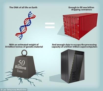 科学家还认为,存储在所有现在动植物DNA分子中的基因信息足以达到一百万兆台超级计算机的处理能力上限。