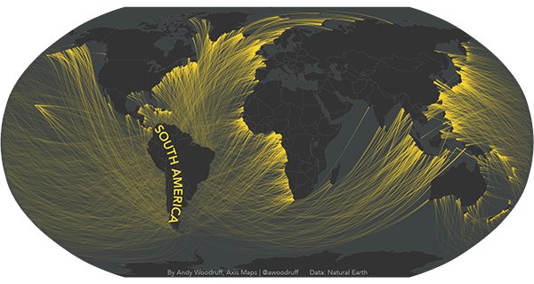 去年,Laris Karklis和Weiyi Cai受到Eric Odenheimer的启发,制作了一批地图,用球极平面投影(stereographic projection)将世界上维度相同的各个国家横跨海洋连接在一起。他们使用了黄色来代表亚洲,蓝色代表欧洲,紫色代表北美,绿色代表南美,红色代表非洲。