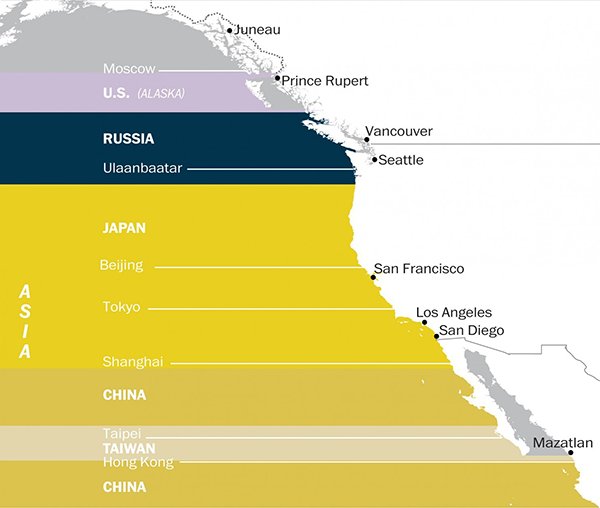 北美洲西海岸所对应的城市与国家。(The Washington Post)