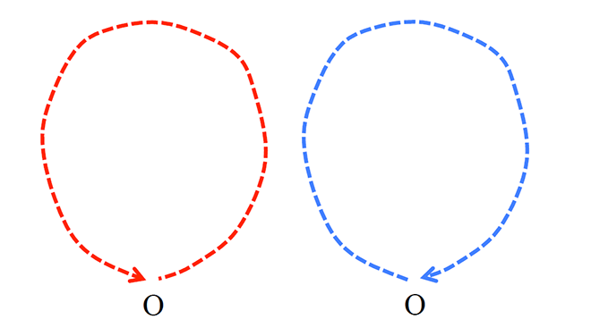 若今天 A 跟 B 是同一个点 O,意即考虑一个粒子从某点出发后,又回到原来那一点的机率,上面这个论述依旧成立,但值得注意的是有些路径间两个波可以有“建设性干涉”(见图三),简单的估计可以发现,考虑这些量子的建设性干涉,粒子回到原点的机率是古典的 2 倍!