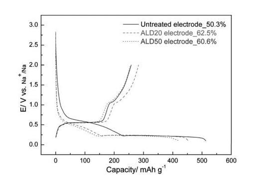 图八 未处理的Na2C8H4O4电极及原子层沉积技术处理后的Na2C8H4O4两类电极的充放电曲线