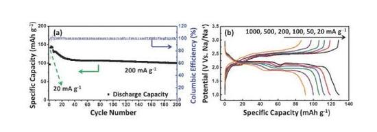 FeFe(CN)6单晶纳米颗粒表现出优异的钠存储性能,可逆容量120 mAh g?1 ,库伦效率约为100%。20C时,仍然具有良好的倍率性能,500个周期后容量保持率达87%,具有优异的循环稳定性,可以成为一种低成本、无污染的钠离子电池正极材料。