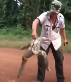 第一段影片中,男子正在展示一只身体上下一样粗、四肢长长的动物,它就像穿了迷彩服,头颈细长,乍看有点像乌龟,男子先在动物身上轻轻抚摸几下,接着将试图爬离马路的动物拖到路中间,最后用手抓起整只动物,但因为该动物从头至尾正面几乎都朝下,无法看清楚真正面目。