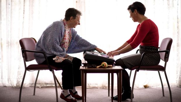 Felicity Baker教授正在与77岁痴呆症患者Leonie Fitzgerald排练歌曲。照片来源:Eddie Jim