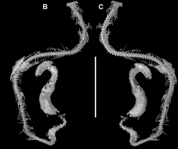 科学家透过X射线断层成像技术取得蛇类标本的3d构造图。