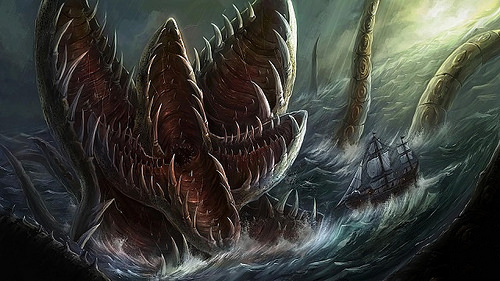 据说神话中的海怪(如图所示)是一种远古时有触手的怪物,它会吃鲸鱼并吞没船只。关于这个怪物的故事可追溯到12世纪的挪威。这些故事经常提到一个生物,它大得让人误以为它是一座岛。