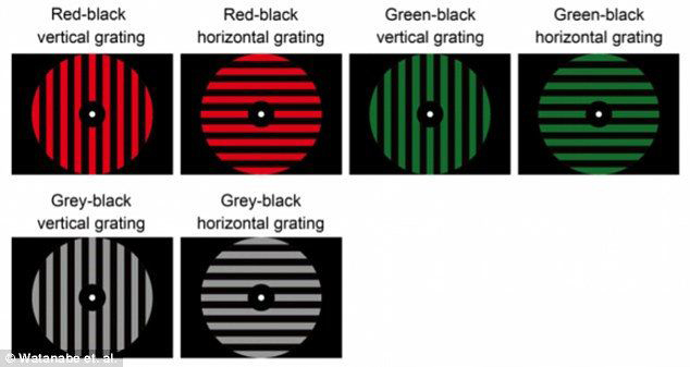 在三天之中,研究团队训练自愿受试者,将横条纹与绿色联想在一起,将直条纹与红色联想在一起。
