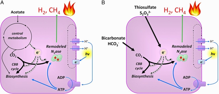 如同科学美国人杂志解释这个过程,这个细菌,R. palustris,也被修改过,以便于增加修改后的固化氮的生产程度。就好像在自然反应中,这个酶需要被阳光刺激,来产生完成反应所需要的能量。测试结果是大有可为的。然而,从二氧化碳到甲烷的过程效率,很接近从氮到氨的自然过程效率。Harwood说:“正常的酶对每一个氨[分子]产生大约两个氢,改变后的酶对每一个甲烷分子产生一千个氢。”