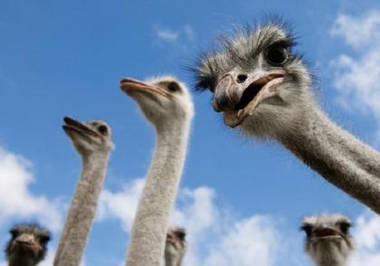 鸵鸟把头埋进沙中:鸵鸟是已知最大的鸟类,它能够以40英里每小时(约64公里每小时)的速度飞奔。但是它不会把头埋进沙中作为一种防御方式。当面临威胁的时候,它们会匍匐在地上进行躲避。当它们从地上起来时,它们的头从远处看就像埋进了沙中。