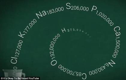 你可能知道水的化学分子式是H2O,但你知道你身体的化学式吗?来自美国德克萨斯州的一位生物学家兼科学作家乔·汉森(Joe Hanson)博士就对这一问题进行了一番研究,计算出了人体的化学元素组成。