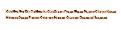 要是完整写下来,人体的化学分子式将是:Co1 Mo3 Se4 Cr7 F13 Mn13 I14 Cu76 Zn2,110 Fe2,680 Si38,600 Mg40,000 Cl127,000 K177,000 Na183,000 S206,000 P1,020,000 Ca1,500,000 N6,430,000 C85,700,000 O132,000,000 H375,000,000。