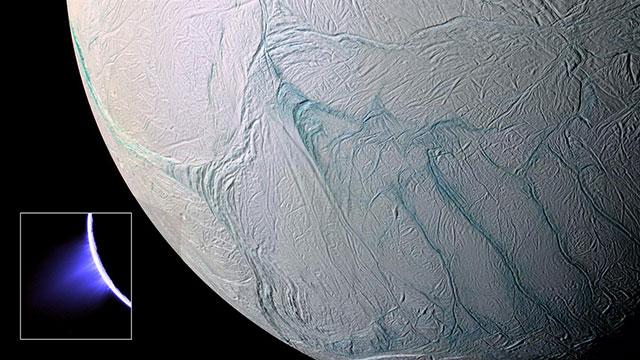 小图为卡西尼号拍摄的土卫二南极热泉喷射出的羽状物,这些羽状物形成的气体云被卡西尼号测定有分子氮,甲烷,二氧化碳,水蒸气等成分,大图为卡西尼号拍摄的土卫二南极附近“虎皮条纹”地形