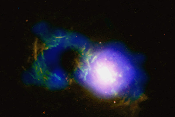 这个“茶杯”的柄是一圈可见光和X光,它环绕着一个巨大泡泡。杯柄的结构距离黑洞大约3万光年,可能是黑洞一次以上的喷出物质所形成的。