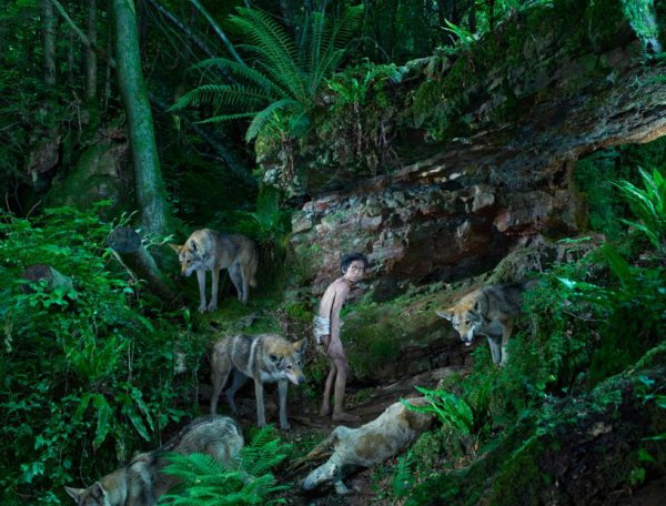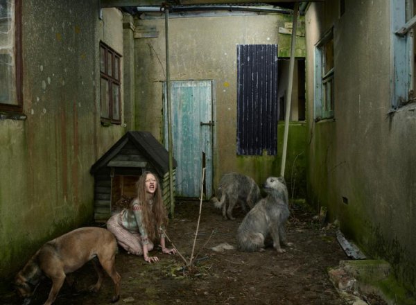 在摄像师Julia Fullerton-Batten最新的画展中有这些梦幻的、像童话一般的作品,美丽同时也令人不安。“然而这些描绘的生命是真是发生的。画展中主要有两种场景,一类是孩子消失在丛林中;另一类孩子却是在家里,由于被忽视和虐待,他们觉得相比于人,和动物们生活在一起更舒服自然,”摄像师向BBC 文化如此描述道。图一再现了乌克兰女孩Oxana Malaya的境地,Oxana于1991年被发现在和狗生活在狗窝里。她当时八岁并且和狗共同生活了6年。她的父母都是酒鬼,在她三岁的时候,有一天父母把她忘在了屋外,小Oxana爬进了狗窝和那些土狗蜷缩在一起以寻求温暖。事实上这么做救了她的生命。 她走路时手脚并用,喘气时伸出舌头,露出牙齿像狗一样吠叫。 由于何人缺乏交流, 她只懂得“YES”和“NO”两个词汇。 现在Oxana住在Odessa的一家诊所里,和医院里的农畜一起工作。