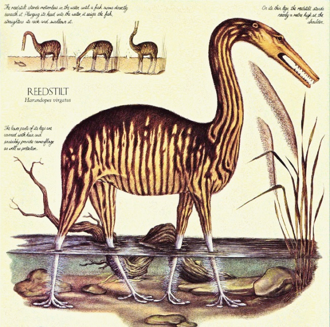 高跷苇(Reedstilt)学名Harundopes virgatus,是一种体型如恐龙的鼹科动物,栖息在河岸,以鱼类为食。主要栖息地是北大陆 (Northern continent)。独特之处在于它们的颈部构造,所有哺乳动物都只有7个颈椎,它们却有15个。