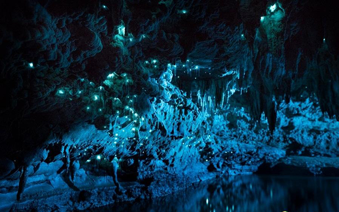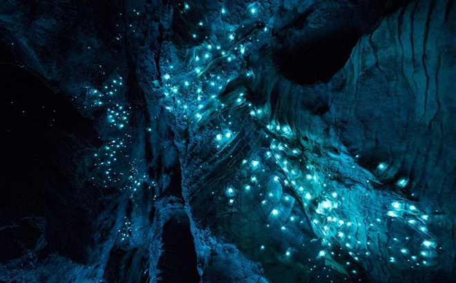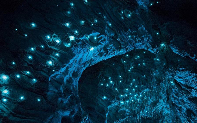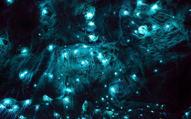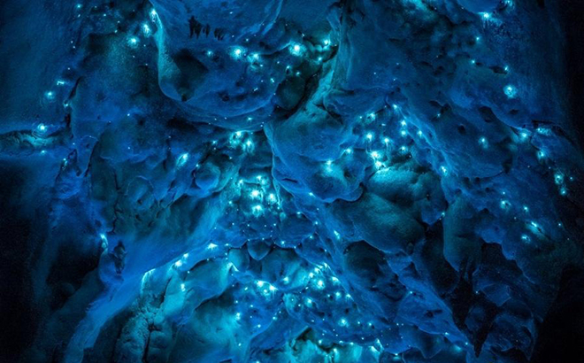 在新西兰石灰岩洞的深处栖息着无数的发光生物,它们发出的蓝绿色光芒足以照亮它们所居住的地方。这些奇特的生物被称为小真菌蚋,它们原产自新西兰的北岛地区。