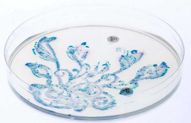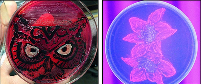 左图作品叫做“这是粪便吗?”图中黑色轮廓是使用沙门氏菌制造的硫化氢形成的猫头鹰面孔;右图作品叫做“双歧杆菌的微型花朵”,是使用双歧杆菌亚种形成的,这种益生菌广泛使用于乳制品。