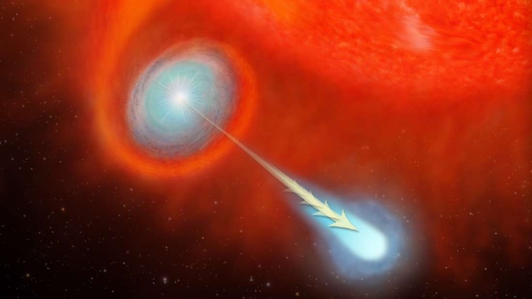 因此,研究人员认为有另外一颗较小的恒星,以高度椭圆的轨道环绕着这颗恒星。这颗小恒星摆荡通过红巨星的外层时,会拿走一些物质,然后这些物质形成一个碟状物。当这个碟状物形成并达到引爆点时,最终被发射到外太空。而在过去的400年,它一直这么做。