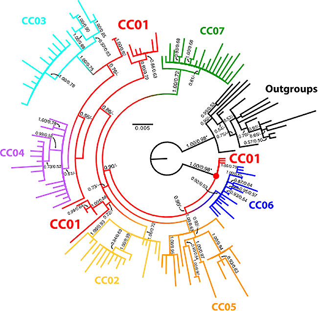 结果表明,涉案的七个人身上的艾滋病病毒有最近的亲缘关系,并且CC02~CC07的样本都源自于CC01的不同分支,呈现并系群(paraphyly)的状态。换句话说,CC01是感染源,他身上的病毒中有一小部分感染了CC06,一小部分感染了CC07,一小部分感染了CC05……以此类推,由于每次感染都只有一小部分病毒从CC01身上跑到其他人身上,所以从CC02至CC07的所有样本的病毒才会簇居在CC01这个源头分支之下,彼此之间都是独立分支。