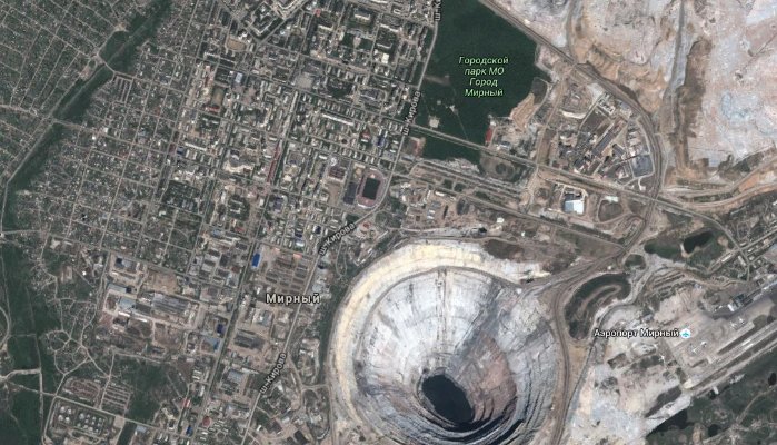 它又叫做钻石城,看起来像一个被陨石撞击的城镇。位于西伯利亚东方Mirny的Mir矿场,有1722英尺深,直径3900英尺长,而且它的钻石资源非常多,因此它使苏联从战乱之地、贫穷之国,变成第二次世界大战后期,当代全球的超强国。