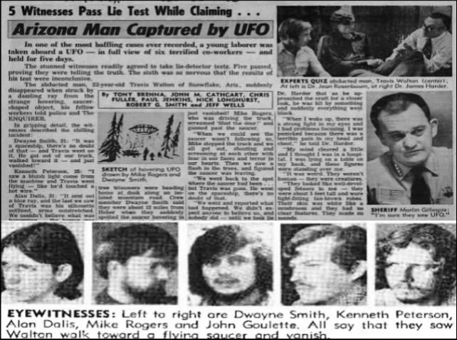 5. 1975年11月,亚利桑那州6名林业工人报案表示他们的同事崔维斯 (Travis Walton) 被一道来自空中的光速牵引,吸进盘旋在树木上方的幽浮。警方当然不采信他们的说词,而且怀疑他们杀了崔维斯并弃尸。