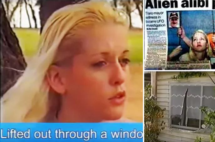 1. 2001年10月,来自澳洲甘迪亚 (Gundiah) 的22岁女子艾咪 (Amy Rylance) 与丈夫凯斯 (Keith Rylance) 及友人佩特拉 (Petra) 当时正在夫妻俩家中。半夜11:15佩特拉被一阵怪声惊醒,循着音源前去客厅查看,发现沉睡中的艾咪正被窗外的一道光束“吸引”漂浮在半空中,穿过开着的窗户,飘向外头的一艘巨大太空船。