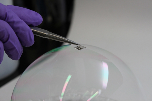 在这项实验,它展示出完全可能创造出超薄版本的太阳能电池。它是非常的轻,甚至无法蹦出成一个肥皂泡泡,能够被加到任何既有的物质上。它是由一层非常薄的聚对二甲苯(保鲜膜厚度的十分之一)与邻苯二甲酸二丁酯(DBP)结合所做成的。