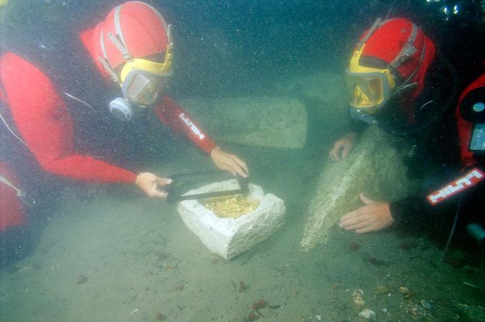 潜水人员谨慎地检查着一个装着黄金碎片的石头,日期始于西元前六世纪,我很惊讶它们如此完整无缺。