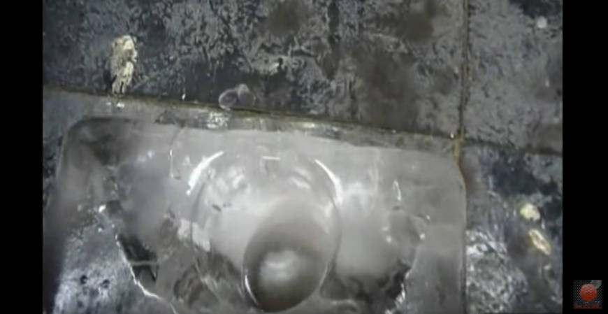 对准中心位置,放开它,瞬间就融化厚厚的冰层,匀速陷落下去了,颜色也变得好像生的鸡蛋黄