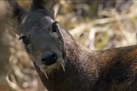 起初一看,还以为是某种变种吸血鬼鹿,没想到原来这两个尖锐的虎牙,就跟一般鹿角一样的功用,是为了交配与各个雄性竞争而长出来的!从上个世纪一直到现在,科学家一直以为麝香鹿已经绝种了!不过,去年底竟然是60年来在野外第一次看到他们踪迹呢!