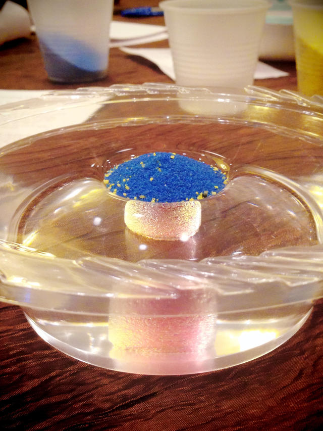 魔术沙刚发明时曾被考虑用作处理原油泄漏,但因为成本不合算,最终它更多还是成了一种玩具。在这里,波多黎各大学的学生为魔术沙发明了一种新玩法:用它做个蘑菇。为了尽可能减少与水的接触,魔术沙入水后会聚成一坨,这坨沙子甚至可以被塑造成各种形状,而完全不用担心把周围的水搅浑。而疏水性又帮助蓝色的魔术沙在水面上漂浮,形成“蘑菇伞”的样子。