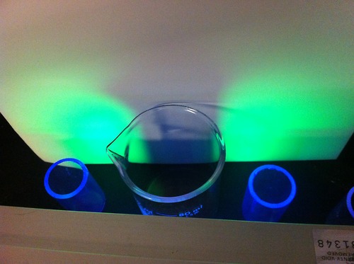 在两层不混溶的溶剂中分别加入荧光物质,在紫外光的照射下,就得到了这张双重的荧光。上层溶剂是己烷,其中溶解了苝(perylene),呈现蓝色荧光;下层溶剂是水,其中溶解了常见的荧光染料荧光素(Fluorescein),它会发出明亮的绿色荧光。