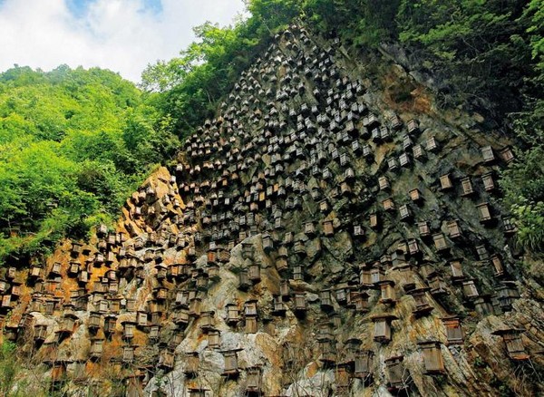 湖北省神农架林区木鱼镇官门山一处峭壁上,悬挂有数百个蜂箱,已成为当地的一道奇观。据悉,悬挂这些蜂箱的目的是吸引更多的蜜蜂在此安“家”。