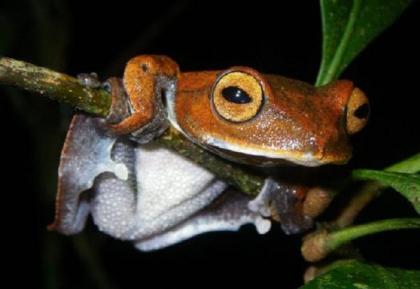 吸血鬼树蛙:吸血鬼树蛙并不具备吸血用的尖锐毒牙,它们事实上非常简单甚至有点令人讨厌。这种棕色小青蛙在脚趾间有着额外的褶皱,能帮助它们滑行更远的距离。真正有趣的其实是它们的蝌蚪形态,它们拥有巨大的锋利黑牙。小蝌蚪生活的水池中缺乏食物,雌性青蛙会产下未受精的卵充当食物。小蝌蚪会用尖牙切断卵黄周围的粘液并吞下。