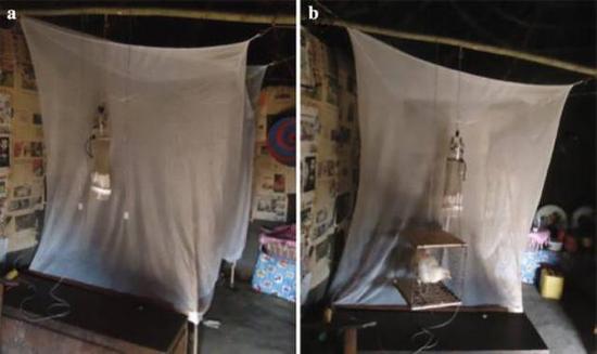 研究者用各种气味分子做捕蚊实验的照片,左图是使用鸡的气味分子,右图是使用一只活鸡。图片来源于该研究的原始论文。
