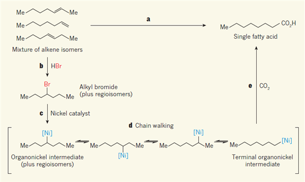 近日,西班牙科学家发明一种化工制程,能将多个化合物混杂的原料,有效地转换成单一种产物(图三a)。如图三,这个制程共有三个步骤。首先,将结构不同的烯类原料和氢溴酸(HBr)作用。氢溴酸会打断烯类的双键,并在原本的C=C处接上一个氢原子和一个溴原子(图三b)。接着,将溴处理过后的原料通过镍金属,碳溴键结(C-Br)暂时地被置换成碳镍键结(C-Ni)。由于镍金属的催化及周遭充满碳水化合物,使得碳镍键结变得不稳定。碳镍键结可以在碳链上移动,直到它到达分子的末端才会稳定(图三c, d)。最后,通入二氧化碳气体,碳镍键结被转换成羧基(-COOH),使分子变成脂肪酸(图三e)。这个制程有一个非常棒的性质:无论一开始原料的双键在哪里,都会因为碳镍键结的移动,产生结构相同的脂肪酸!