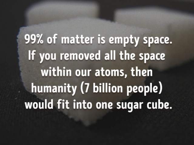 8. 物质的99%其实都是空的。也就是说,如果把身体里所有原子里的空间移开,70亿人口其实可以缩到一颗方糖那么小。(登愣~那我不就只是70亿分之一颗方糖吗,这已经称不上方糖了,根本是糖渣中的渣而已吧QQ)