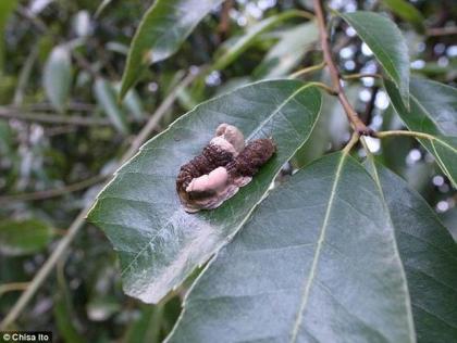 这种生长在日本境内的毛毛虫体色黑白相间,乍一看很难相信它们是栖息在绿叶上的毛毛虫。然而这种毛毛虫栖息在树枝上会扭曲身体,看上去非常像一坨鸟类粪便。目前,研究人员发现这种伪装技能对鸟类非常有效,增大了毛毛虫的幸存率。这项最新研究报告发表在近期出版的《动物行为学》杂志上。