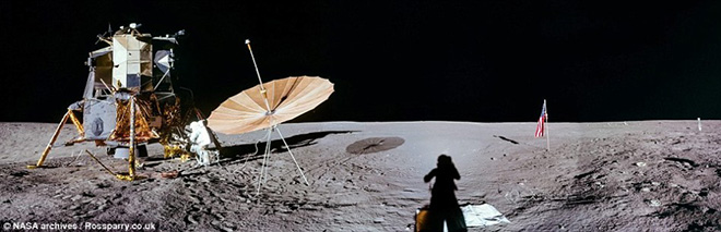 阿波罗任务中的大量图片都是由宇航员本人拍摄的,所用器材是绑在他们胸前的哈苏相机。这张拼接图片显示的是阿波罗12号任务时的场景,可以看到宇航员面罩上的清晰投影。