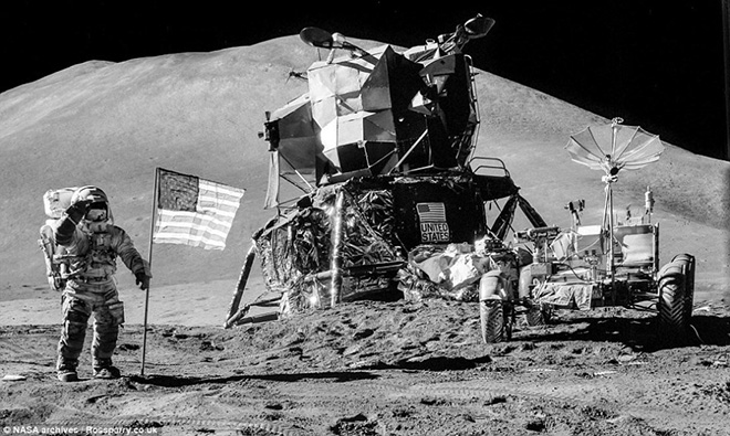 阿波罗15号是第四次登陆月球的任务,并第一次使用了月球车(在这张拼接图片中可以看到)。指挥官大卫·斯科特和登月舱驾驶员詹姆斯·埃尔文在月球上待了三天时间,包括18个小时的舱外活动。