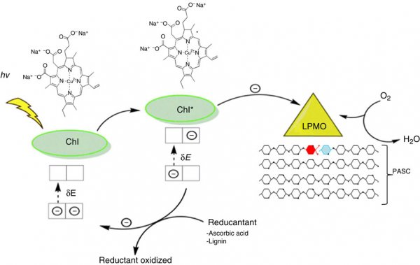 根据哥本哈根大学团队的介绍,这个过程跟植物在自然环境中一样,也是将阳光俘获在叶绿素分子中。然后,再加入一种叫做单氧酶的天然酶,这样太阳能就开始分解植物生物量,这个过程会产生化学物质和能量。