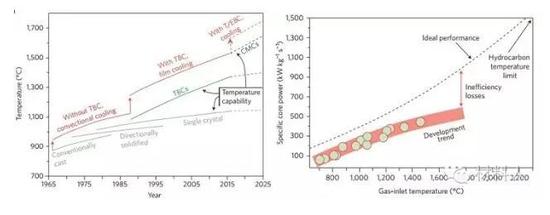 图1 a(左):几种发动机材料的温度性能发展示意图(包括镍基高温合金、TBC、CMC、以及附带冷却系统的材料体系);b(右):入气口温度随燃气涡轮发动机比动力的增加而急剧增加。