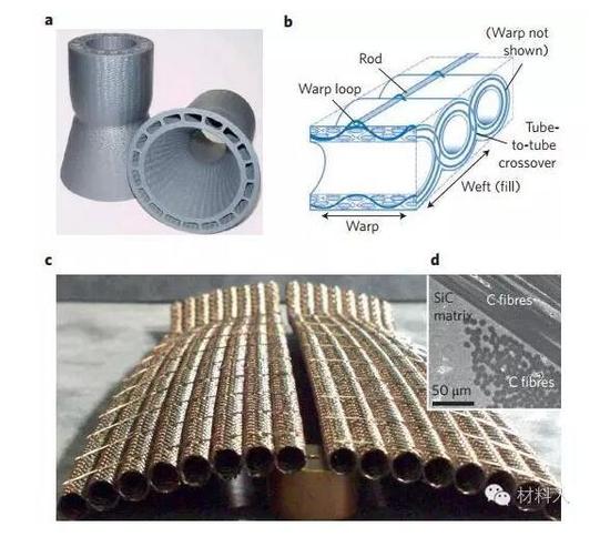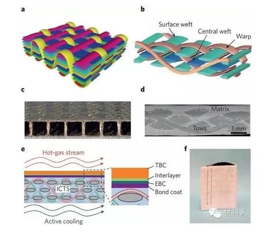 积分陶瓷编织结构(ICTSs)融合纺织、数学计算、陶瓷、机械于一体,是CMCs领域的一种新型范例,在喷气涡轮发动机以及高超音速、火箭发动机等方面拥有极大的前景。只要定量确定了整体部件的外形(例如燃烧室衬里、叶片)、每一位点的性能参数或者功能需求(机械/热应力、热传导、蒸腾作用等),通过ICTSs就可计算设计得到一个满足上述条件的中空3D纤维预制品。其主要是基于组成材料(纤维、基体和界面)的拓扑考量和具体性质(物理、热、机械等)而得到优化。例如,贯穿的弯曲纤维丝束可阻止快速失效(图3b)。