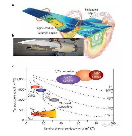 碳基烧蚀材料可用于短持续、非重复利用的发动机,对于高超音速飞行(>1h)、重复利用的发动机,就需要革命性的抗烧蚀材料。高热导率的陶瓷或可以承受上述高温(被动冷却,图4c),难熔的硼化物(也称超高温陶瓷(UHTCs),例如ZrB2)结合了众多优异特性(图4c),也被广泛研究。